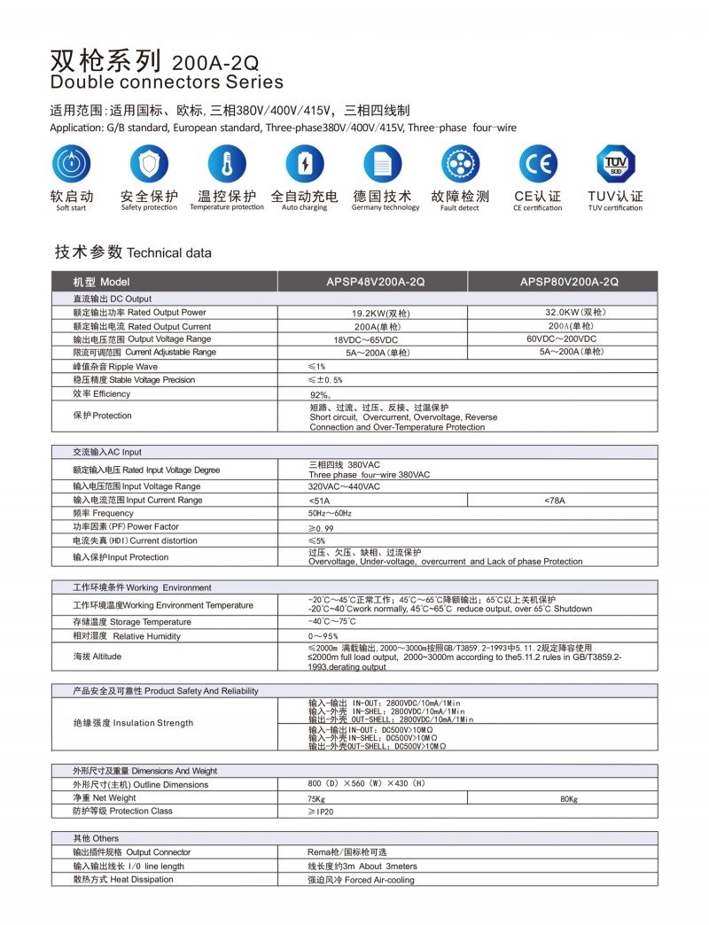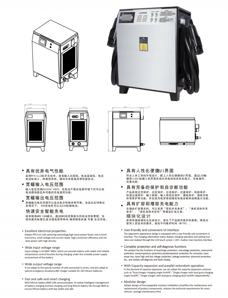 觸摸屏智能操作設計:告別傳統按鍵方式,給您帶來更現代更具科技智能的操作體驗 自動充電:插槍自動充電,簡化充電流程,便于操作 兼容性高:80V200A兼容48V200A充電 多重保護: 輸出短路,過流過壓保護,反接保護,電流導管保護等多重保護 預約充電功能:避開高峰用電時段,有效節省成本 雙語切換:中英文雙語隨需切換,跨越語言障礙,與世界接軌 人性化設計:充電機背板內部附部件明細及產品接線圖,方便客戶可更清楚的了解產品,便于維修,提高售后時效 獨特設計: 內置電磁鎖驅動模塊,防止臨時斷電鎖槍 使用壽命更長:功率模塊預留20%空間,提高模塊的使用壽命 出色內部結構: 內部結構左右出風,內部電路不容易積粉塵,提高充電機壽命
