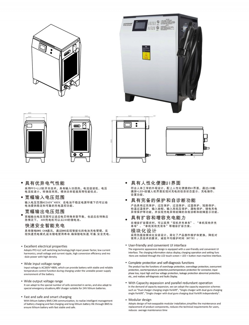 觸摸屏智能操作設(shè)計:告別傳統(tǒng)按鍵方式,給您帶來更現(xiàn)代更具科技智能的操作體驗 自動充電:插槍自動充電,簡化充電流程,便于操作 兼容性高:80V200A兼容48V200A充電 多重保護: 輸出短路,過流過壓保護,反接保護,電流導(dǎo)管保護等多重保護 預(yù)約充電功能:避開高峰用電時段,有效節(jié)省成本 雙語切換:中英文雙語隨需切換,跨越語言障礙,與世界接軌 人性化設(shè)計:充電機背板內(nèi)部附部件明細及產(chǎn)品接線圖,方便客戶可更清楚的了解產(chǎn)品,便于維修,提高售后時效 獨特設(shè)計: 內(nèi)置電磁鎖驅(qū)動模塊,防止臨時斷電鎖槍 使用壽命更長:功率模塊預(yù)留20%空間,提高模塊的使用壽命 出色內(nèi)部結(jié)構(gòu): 內(nèi)部結(jié)構(gòu)左右出風,內(nèi)部電路不容易積粉塵,提高充電機壽命