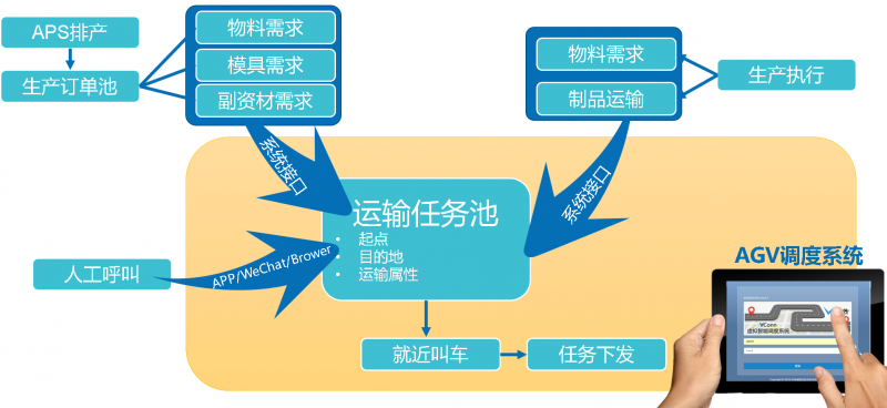 用AGV調(diào)度系統(tǒng)(VConn)完成物料計(jì)劃下發(fā),現(xiàn)場(chǎng)叫料之間的系統(tǒng)閉環(huán),考慮到異常送料需求,系統(tǒng)保留人工呼叫接口,可以快速與第三方系統(tǒng)或設(shè)備對(duì)接