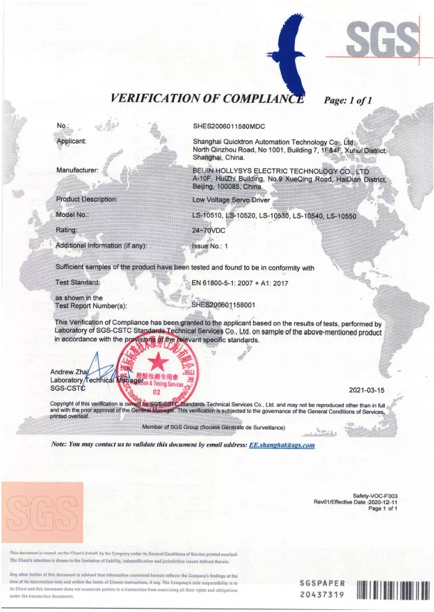 SGS是全球領(lǐng)先的檢驗(yàn)、鑒定、測(cè)試和認(rèn)證機(jī)構(gòu),是全球公認(rèn)的質(zhì)量和誠(chéng)信基準(zhǔn)。SGS作為國(guó)際權(quán)威認(rèn)證機(jī)構(gòu)為和利時(shí)電機(jī)產(chǎn)品頒發(fā)CE證書(shū)和RoHS證書(shū),是對(duì)和利時(shí)電機(jī)技術(shù)實(shí)力的專(zhuān)業(yè)背書(shū),增強(qiáng)了和利時(shí)電機(jī)產(chǎn)品在國(guó)際市場(chǎng)的品牌力,也助力設(shè)備制造商加速全球化步伐。