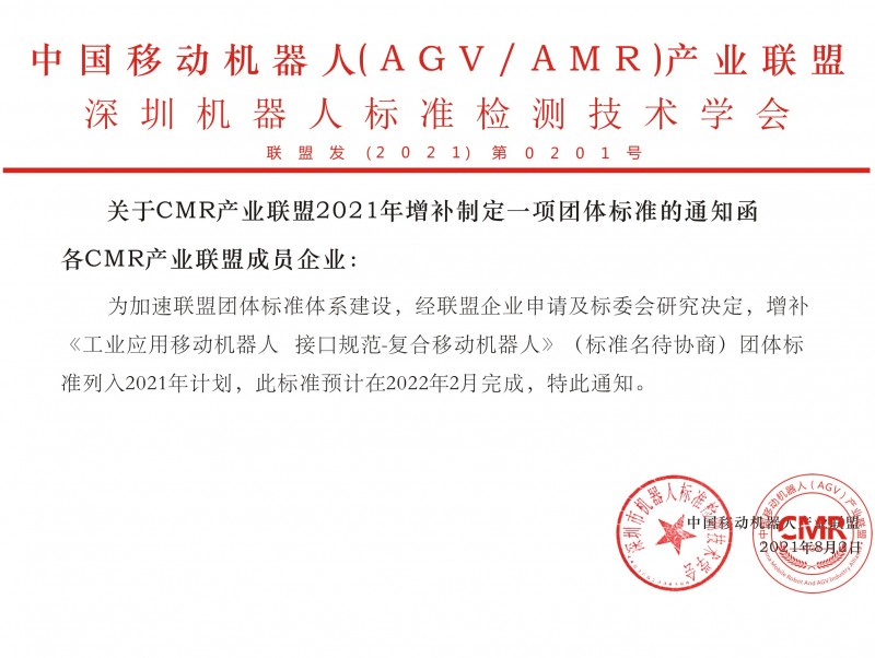 深圳市機器人標(biāo)準(zhǔn)檢測技術(shù)學(xué)會關(guān)于新增復(fù)合移協(xié)機器人相關(guān)團體標(biāo)準(zhǔn)的通知函