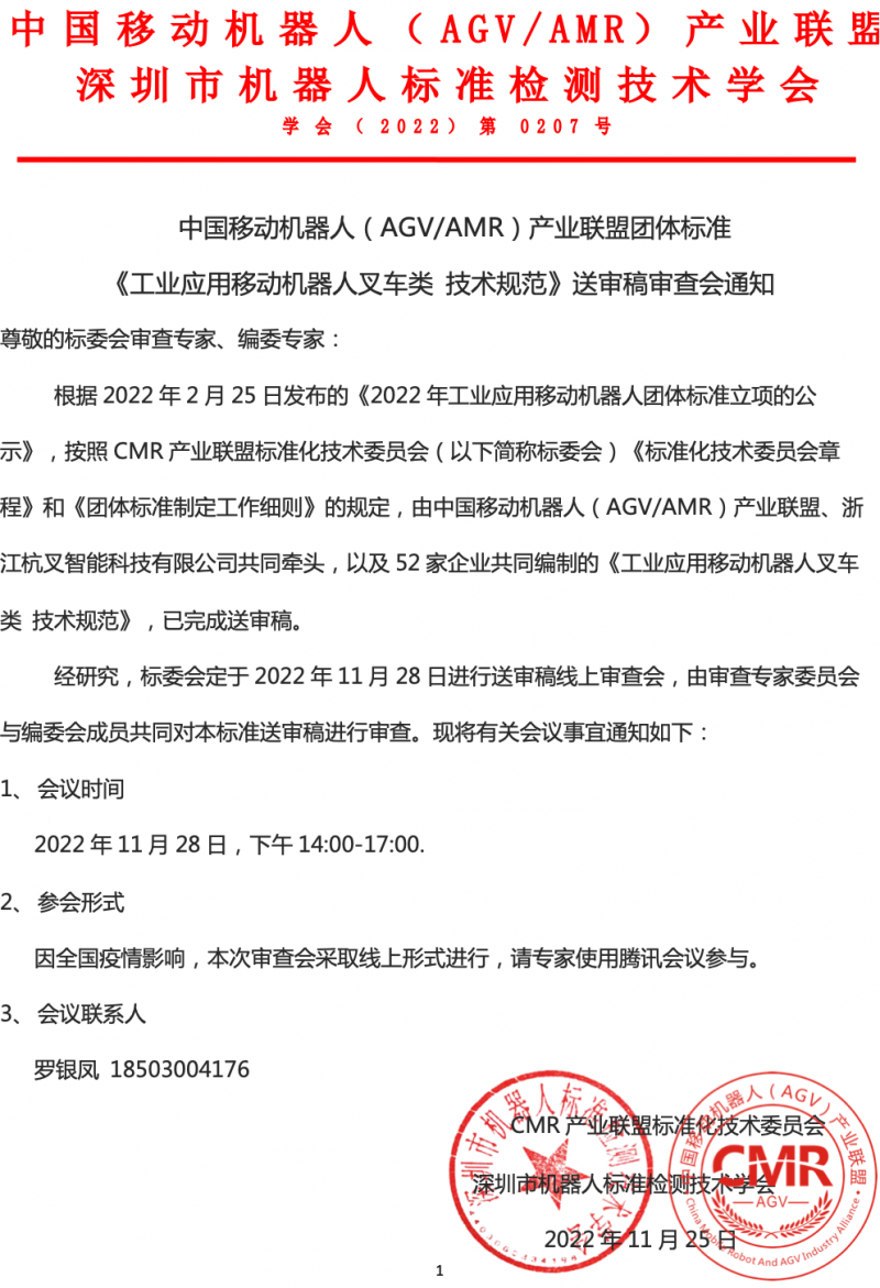 關于《工業應用移動機器人叉車類 技術規范》送審稿審查會的通知
