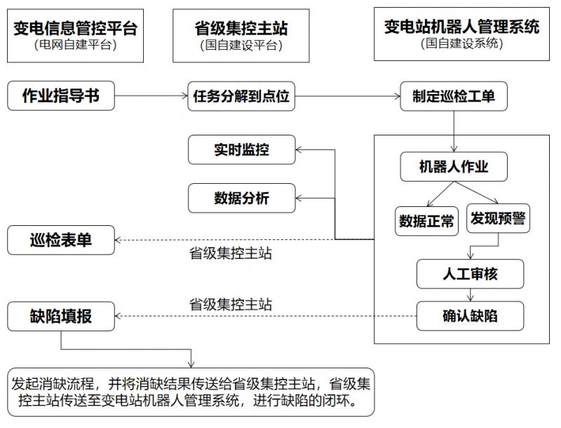 國自智能巡視解決方案使“變電信息管控平臺業務流”、“省級集控主站業務流”、“變電站機器人管理系統業務流”三條業務流實現閉環,三個系統均可派發巡檢任務使機器人精準作業,及時將數據回傳至省級集控主站及變電信息管控平臺,系統互通互聯,打通上下數據流,變電站整體巡檢效率、巡檢精度、變電站信息化水平顯著提升。