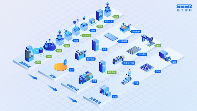 下圖為半導體整體工藝流程圖,其中藍色標注點為『仙工智能半導體解決方案覆蓋環節』。目前,仙工智能已經實現了『成品倉儲』節點全覆蓋。