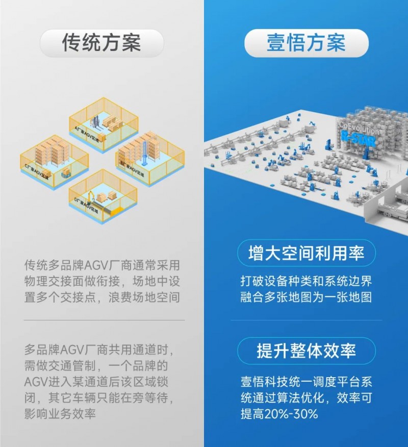 同等作業(yè)效率下,壹悟科技星羅自動(dòng)化工廠解決方案,不僅可以輕松實(shí)現(xiàn)“一套系統(tǒng)調(diào)度全場”,大幅降低改造成本與對(duì)接工作量,還可以通過軟件靈活配置和修改流程,快速適應(yīng)業(yè)務(wù)變化。