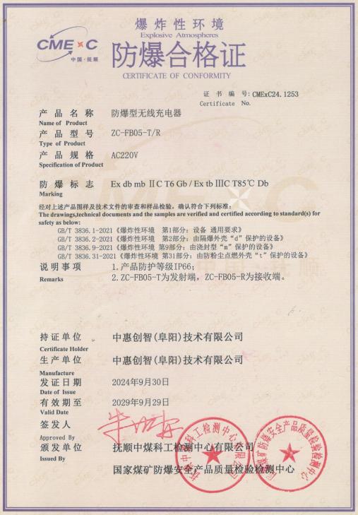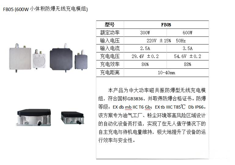 中惠創(chuàng)智FB05具備優(yōu)異的防爆、防塵和耐腐蝕性能。其輸入電壓為220V±15%(50Hz),充電電壓為54.6V±0.2,最大輸入電流3.5A。采用先進(jìn)的磁共振技術(shù),突破了傳統(tǒng)無線充電距離的限制,能夠在 10 - 40mm 的充電距離內(nèi)實(shí)現(xiàn)穩(wěn)定的自主充電。它的問世,無疑為高風(fēng)險(xiǎn)區(qū)域自動化設(shè)備領(lǐng)域帶來了一場深刻變革。在油氣工廠、粉塵環(huán)境等特殊場景中,它解決了長期以來困擾企業(yè)的充電安全難題,為自動化設(shè)備的穩(wěn)定運(yùn)行提供了堅(jiān)實(shí)保障,推動了這些行業(yè)的智能化升級進(jìn)程。