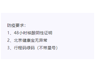 1、48小時(shí)核酸陰性證明;2、北京健康寶無異常;3、行程碼綠碼(不帶星號)