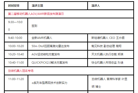 10月27日 第四屆中國(guó)國(guó)際移動(dòng)機(jī)器人(AGV/AMR)產(chǎn)業(yè)發(fā)展大會(huì) 10月28日 第二屆移動(dòng)機(jī)器人(AGV/AMR)新品發(fā)布路演專(zhuān)場(chǎng) 10月2...