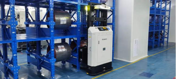 其次,針對(duì)極卷搬運(yùn)及上下料的中段工藝應(yīng)用場(chǎng)景,佳順智能開發(fā)了兩款采用激光SLAM導(dǎo)航的專用單叉/雙叉臂舉升AGV,最大負(fù)載可達(dá)1.8T,結(jié)合激光測(cè)距和二維碼技術(shù)進(jìn)行精確定位,擁有360°避障雷達(dá)、急停按鈕、機(jī)械防撞機(jī)構(gòu)、聲光報(bào)警等多種避障功能,實(shí)現(xiàn)生產(chǎn)安全、穩(wěn)定運(yùn)行。