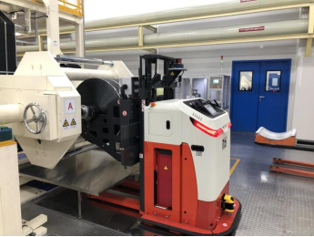 針對(duì)電芯中段工藝分切至卷繞/疊片這部分的極卷搬運(yùn)場(chǎng)景,佳順智能開發(fā)了單懸臂AGV,最大負(fù)載850KG,結(jié)合激光測(cè)距和二維碼技術(shù)進(jìn)行精確定位,擁有360°避障雷達(dá)、急停按鈕、機(jī)械防撞機(jī)構(gòu)、聲光報(bào)警等多種避障功能,實(shí)現(xiàn)生產(chǎn)安全、穩(wěn)定運(yùn)行。