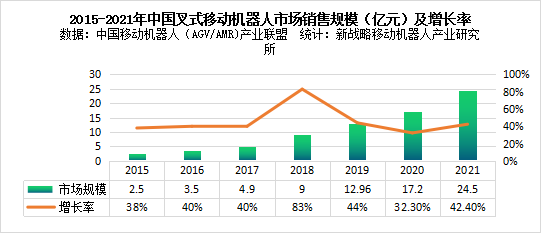 圖表:2015-2021年中國(guó)叉式移動(dòng)機(jī)器人市場(chǎng)銷售規(guī)模(億元)及增長(zhǎng)率