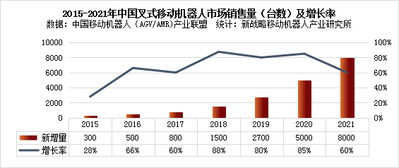 圖表:2015-2021年中國(guó)叉式移動(dòng)機(jī)器人市場(chǎng)銷售量(臺(tái)數(shù))及增長(zhǎng)率