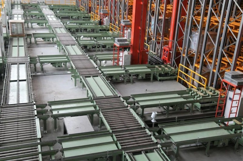 由鏈條輸送機和滾筒輸送機組成的環形輸送線,實現托盤輸送搬運入庫自動化,經過站臺入庫的成品托盤會由輸送線輸送至對應的立體庫巷道入口。