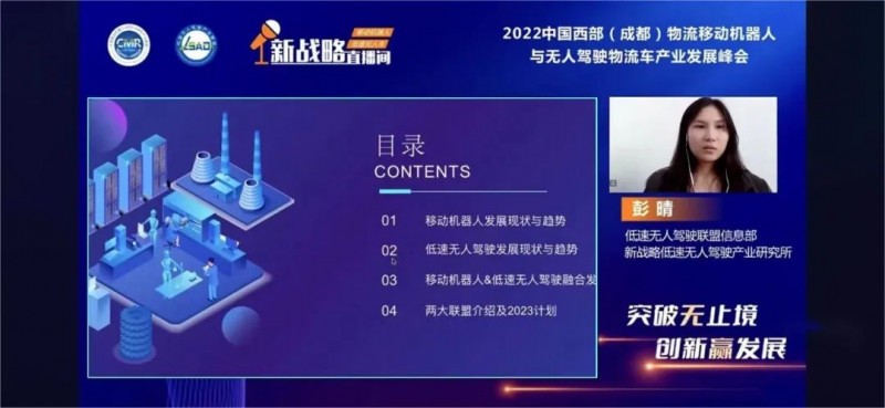 11月23日,由中國移動機器人(AGV/AMR)產業聯盟、低速無人駕駛產業聯盟、《物流搬運機器人》雜志社、《低速無人車》雜志社、成都北辰中金展覽有限公司聯合主辦,新戰略移動機器人全媒體、 新戰略低速無人駕駛全媒體協辦的2022中國西部(成都)物流移動機器人與無人駕駛物流車發展峰會在線上成功舉行!