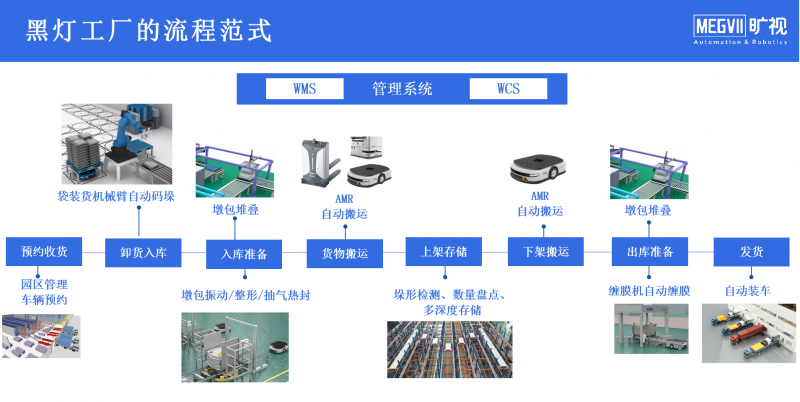 作為深耕行業的新一代智慧物流服務提供商,曠視打造了一套面向“黑燈工廠”物流倉儲部分升級的流程范式,實現從預約收貨到卸貨入庫、入庫準備、貨物搬運、上架存儲、下架搬運、出庫準備、發貨的全流程智能化、自動化、無人化。