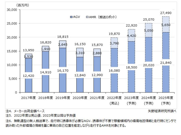 預計22財年日本AGV/AMR的市場規模(制造商出貨量)為7700臺(同比增長20.3%),銷售額為198.7億日元(同比增長25.2%)。雖然半導體短缺的影響仍在繼續,但制造商在前一年努力改善和加強供應系統是積極因素,預計三年來首次出現增長。