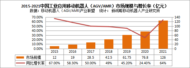 中國市場,根據移動機器人(AGV/AMR)產業聯盟數據、新戰略移動機器人產業研究所統計,2021年度,中國市場企業整體銷售工業應用移動機器人(AGV/AMR)72000臺,較2020年增長75.61%,市場銷售額達到126億元(海外銷售25億元),同比增長64%。其中營收超億元的企業達到36家,同比增長50%。