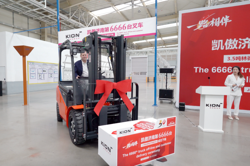 2023年4月13日,一路相伴暨凱傲濟南工廠第6666臺林德3.5噸電動平衡重叉車下線儀式在濟南萊蕪智慧工廠盛大舉行。凱傲集團首席執行官Rob Smith、凱傲集團董事兼凱傲亞太及美洲區總裁郭進鵬凱傲集團執行董事會成員及凱傲中國管理層、海爾集團客戶方代表、媒體嘉賓等出席本次活動,共同見證這歷史性時刻。