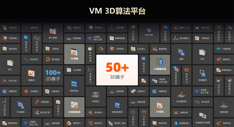 VM 3D算法平臺是專門為3D高精度定位、測量、缺陷檢測設計開發的平臺級軟件,基于圖形化交互、流程式編輯和可視化配置的框架特性,為用戶提供功能豐富、操作便捷的軟件方案開發平臺。