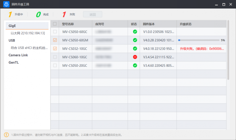工具可批量升級(jí)多個(gè)相機(jī)或采集卡固件,最多可同時(shí)勾選20個(gè)相機(jī)或采集卡。