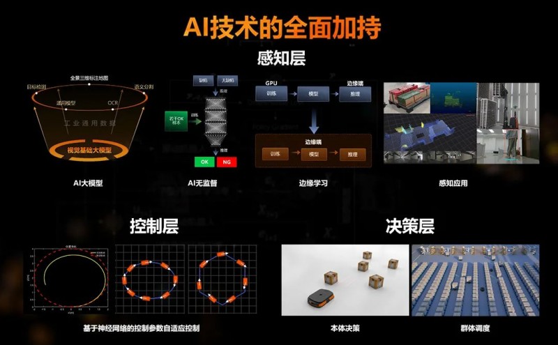 賈永華也提到感知智能的重要性:“正如人的眼睛一樣,未來,我們要給工業(yè)制造裝上更多的‘眼睛’,賦予機器感受外部世界的能力,這是機器人理解和執(zhí)行任務前提。”海康機器人圍繞機器視覺應用特點,近年來重點研究了AI小樣本學習,無監(jiān)督學習以及行業(yè)大模型等技術難題,推出了10多項AI算法工具,積極推進AI+機器視覺在更多行業(yè)的滲透應用;同時海康機器人將AI算法和經(jīng)典算法相結合,推出了AI模板匹配、AI讀碼、邊緣學習等特殊算法,部分讀碼相機已能實線上千幀的讀碼和分析。并在環(huán)境標注方面,基于大模型的特征,海康機器人構建了全景的三維的標注地圖,通過這樣的方式,海康機器人有效提升了建圖定位、點云識別、視覺標識檢測等多種環(huán)境感知的識別精度,使機器對世界的認識更全面。“在控制層面,我們基于模型的最優(yōu)控制,運行規(guī)劃消除偏差,通過迭代學習,使機器人逐漸適應各種環(huán)境,未來其適應能力會越來越強,可以提升控制的自主性和魯棒性。而在當前的決策層面,我們基于AI路徑規(guī)劃能力,通過大量規(guī)劃路徑數(shù)據(jù)的學習,使網(wǎng)絡具備專家級的路徑規(guī)劃能力。同時利用網(wǎng)絡推理并進行預算,實現(xiàn)半徑毫秒級的快速路程規(guī)劃。”賈永華表示,在AI的加持下,極大地增強了智能系統(tǒng)生產(chǎn)能力,這種能力不斷滲透到各個場景、業(yè)務和行業(yè),可以有效地將AI技術真正轉變?yōu)樯a(chǎn)力。
