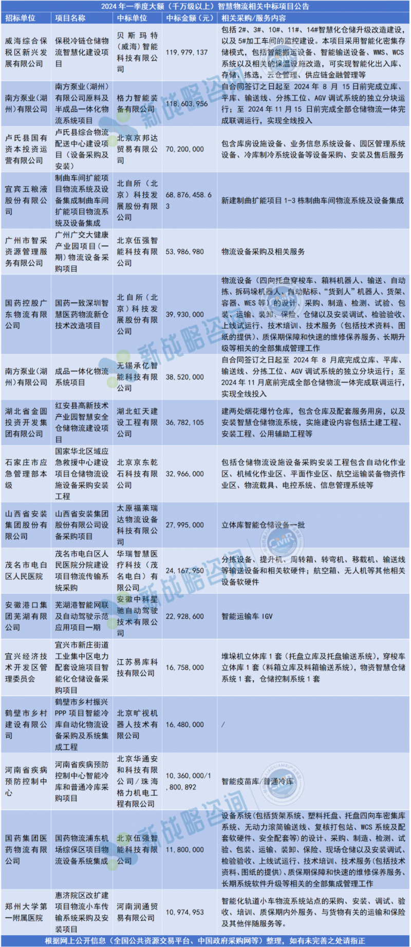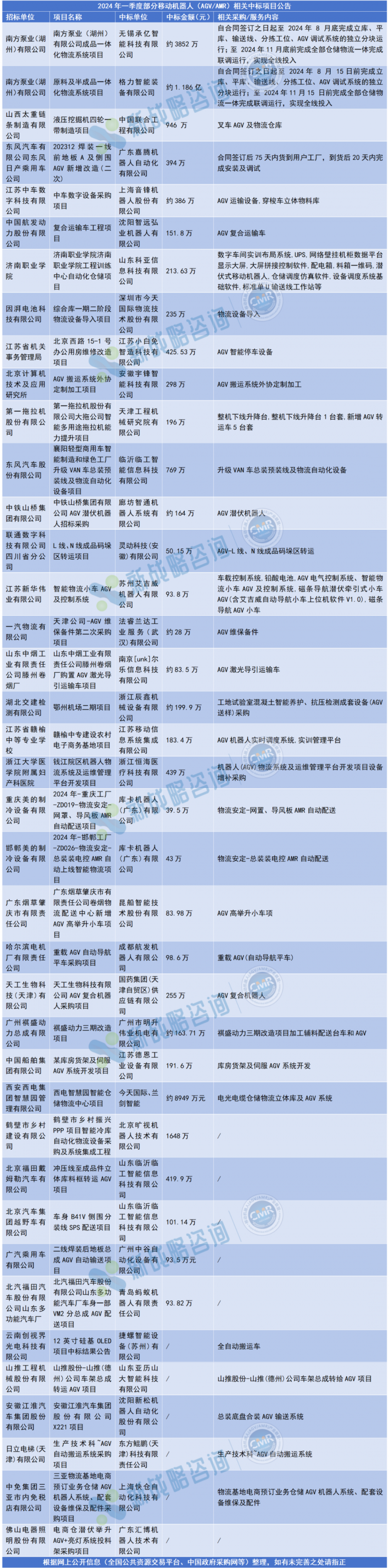其中,一季度移動機(jī)器人領(lǐng)域公開發(fā)布超50項(xiàng)中標(biāo)公告。從移動機(jī)器人領(lǐng)域的中標(biāo)項(xiàng)目分布情況來看,一季度中標(biāo)公告主要集中于汽車行業(yè)及工程機(jī)械行業(yè)。另據(jù)新戰(zhàn)略移動機(jī)器人產(chǎn)業(yè)研究所統(tǒng)計(jì),汽車行業(yè)在2024年一季度釋放超十億元標(biāo)的。其次是物流倉儲業(yè)。此外,醫(yī)療衛(wèi)生、電子等行業(yè)也有較多招標(biāo)項(xiàng)目。