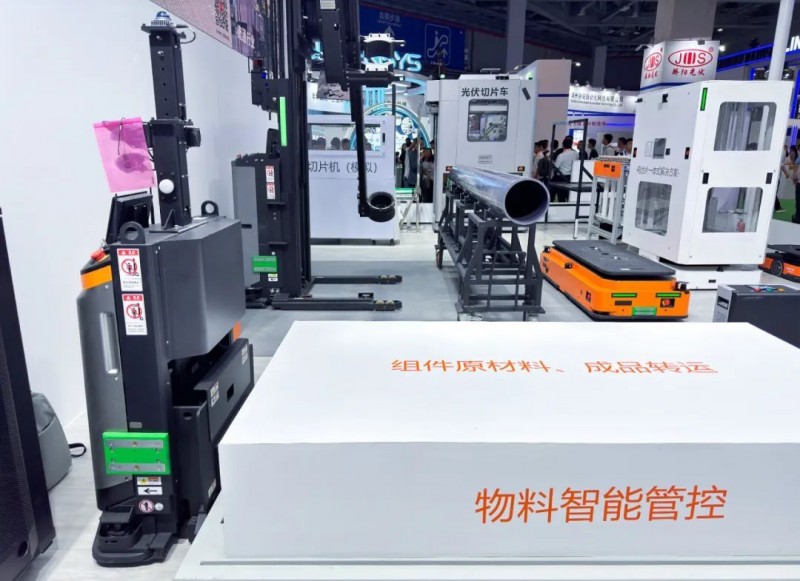 拉晶環(huán)節(jié)展示了自主設(shè)計研發(fā)的自動取晶AMR和重載AMR,二者協(xié)同作業(yè),取晶AMR從料架上取放晶棒,重載AMR進行轉(zhuǎn)運料架,實現(xiàn)晶棒自動化下線和實時轉(zhuǎn)運。