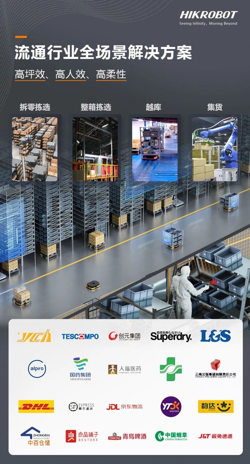 針對流通行業的業務波動量大、效率要求高、業務容錯率低、庫容要求高等核心難題,結合豐富的產品線和解決方案、智能算法等全場景規劃能力,海康機器人為行業伙伴打造了高坪效、高人效、高柔性的解決方案,覆蓋電商零售、鞋服、煙草酒水、商超、圖書出版、3PL、醫藥等細分行業。