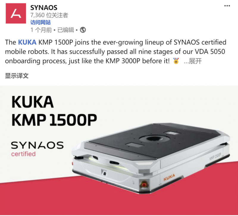 德國SYNAOS公司為世界著名的工業(yè)物流系統(tǒng)開發(fā)集成商。SYNAOS調(diào)度系統(tǒng)采用了現(xiàn)今工業(yè)物流領(lǐng)域主流的VDA 5050 協(xié)議。在SYNAOS公司嚴格的質(zhì)量要求下,KMP 1500P在實現(xiàn)了VDA 5050標準協(xié)議的同時,依次通過了SYNAOS 9步質(zhì)量檢測,達到了認證標準,現(xiàn)已成為SYNAOS集成項目中可靠的組成部分,并且可以應用到更多行業(yè)領(lǐng)域賦能其內(nèi)部物流升級。