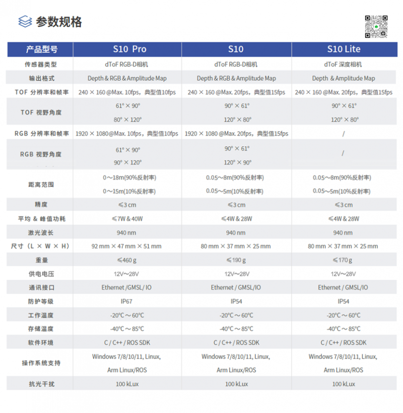 遠距離抗干擾感知:S10基于dToF技術實現18米遠距離探測,在室外強光(100kLux)環境下仍可穩定輸出深度數據,提升無人叉車、割草機、室外巡檢機器人等設備的避障能力。 近距離無盲區:S10基于dToF技術,在30cm以內的區域依然能夠實現較高精度(+/-5cm)的感知,保障移動機器人周邊感知無盲區。 高密度點云輸出:每秒生成超57.6萬個有效點,精準識別低矮物體,為復雜場景下的導航與避障提供高分辨率數據基礎。