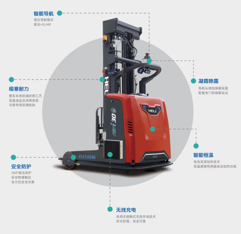 合力憑借深厚的技術沉淀和豐富的制造經驗,推出冷鏈專用版叉車AGV。基于“優質本體+先進控制+溫濕系統+智能平臺”打造領先一代的冷庫叉車AGV—CQD系列,成功攻克了-30℃極低溫度環境下的“高位存儲+智能堆疊+接駁搬運”等場景一體化作業難題。