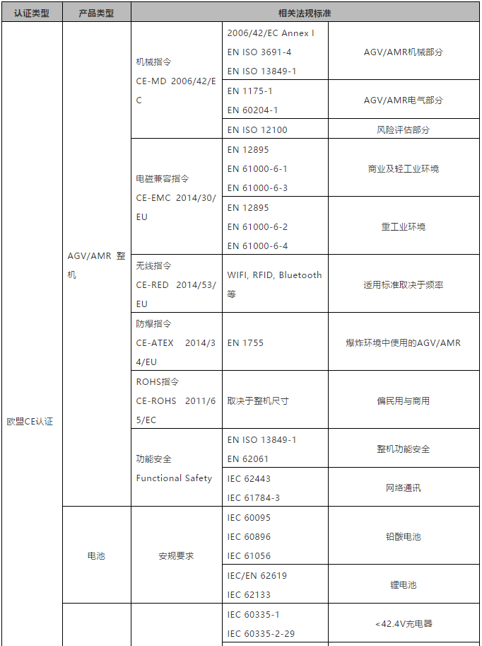 此外,AGV/AMR出口其他國家或地區,如東南亞地區,在當地法規無強制要求情況下時,大多數買家或業主方往往會參考法規與標準體系相對成熟的歐盟CE認證體系要求,以確保產品的安全可靠性。