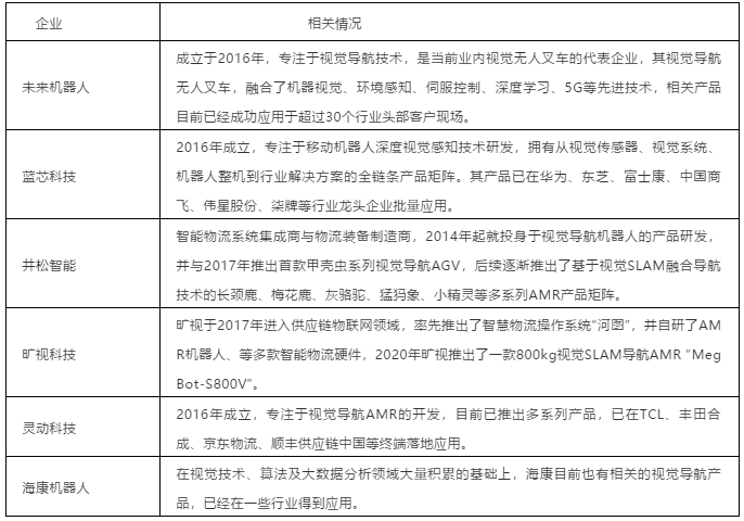 圖表:國內主流視覺導航AGV/AMR廠商(本表粗略統計,如有未完善之處,請指正?。?