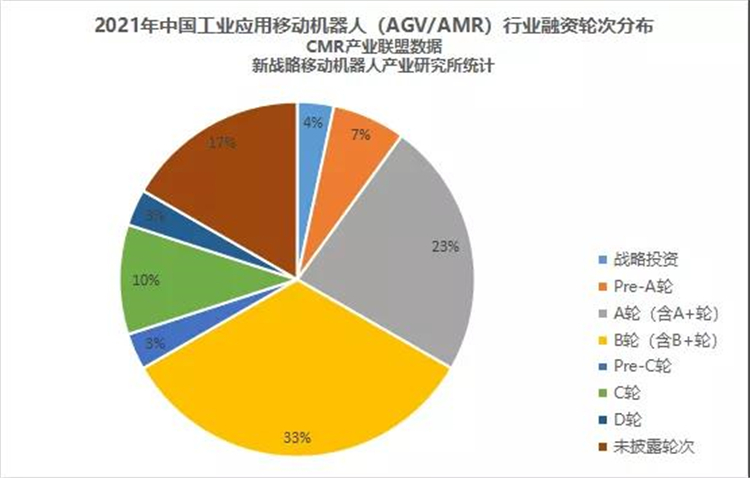 從融資輪次看,2021年工業(yè)應(yīng)用移動(dòng)機(jī)器人領(lǐng)域,戰(zhàn)略融資1起,占比為4%;Pre-A輪2起,占比7%;A輪(含A+輪)7起,占比23%;B輪(含B+輪)10起,占比33%;Pre-C輪1起,占比3%;C輪3起,占比10%,D輪1起,占比3%;5起未披露輪次,占比17%。
