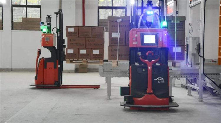 在生產系統的任務下,AGVS調度系統與WCS、WMS實時通訊,智能調度復雜場景不同車型之間的交互配合。戶外牽引AGV完成前端物流配送后,無人叉車聯動叉取在戶外牽引AGV料架上的貨物,并與立體倉庫中的輥筒線系統對接完成貨物到輥筒線上的碼放動作,隨后堆垛機接收系統指令,完成一拖物料的入庫數據鏈。出庫至發貨環節上,再由無人叉車完成最后一公里的搬運任務并實時反饋工作狀態至系統存儲分析,即“無人”物流閉環模式成型。