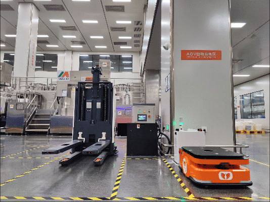 同時,由Gulf-1400-CDD無人叉車機器人負(fù)責(zé)原材料從原料倉到乳化車間的搬運、空桶的產(chǎn)線返回、半成品從產(chǎn)線到車間的中轉(zhuǎn)、包材的產(chǎn)線搬運,搭配FMS調(diào)度管理系統(tǒng),實現(xiàn)最優(yōu)任務(wù)分配方案,讓倉儲物流整體效能最大化。