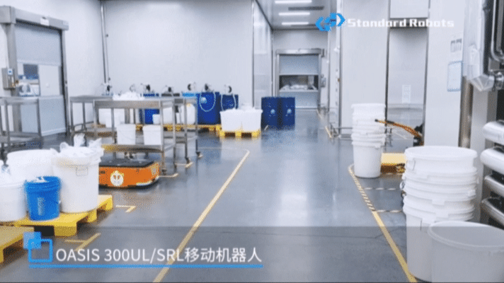 方案中,斯坦德移動機器人OASIS 300UL/SRL負(fù)責(zé)執(zhí)行乳化車間、包材車間物料運輸任務(wù),當(dāng)車間某一設(shè)備需要物料時,由員工使用平板電腦發(fā)送用料需求,通過FMS調(diào)度系統(tǒng)呼叫OASIS 300UL/SRL前來運輸物料。