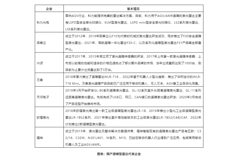 早期國(guó)內(nèi)AGV/AMR行業(yè),無(wú)論是避障型還是導(dǎo)航型雷達(dá)都以外資品牌應(yīng)用為主,但從2015年左右開始,伴隨著整個(gè)國(guó)內(nèi)AGV產(chǎn)業(yè)的發(fā)展,國(guó)產(chǎn)激光雷達(dá)也迎來了發(fā)展機(jī)遇期,出現(xiàn)了一批代表企業(yè),尤其是在避障型雷達(dá)方面,在這些激光雷達(dá)廠商的努力下,已經(jīng)基本實(shí)現(xiàn)了國(guó)產(chǎn)化,取得了重大的突破。