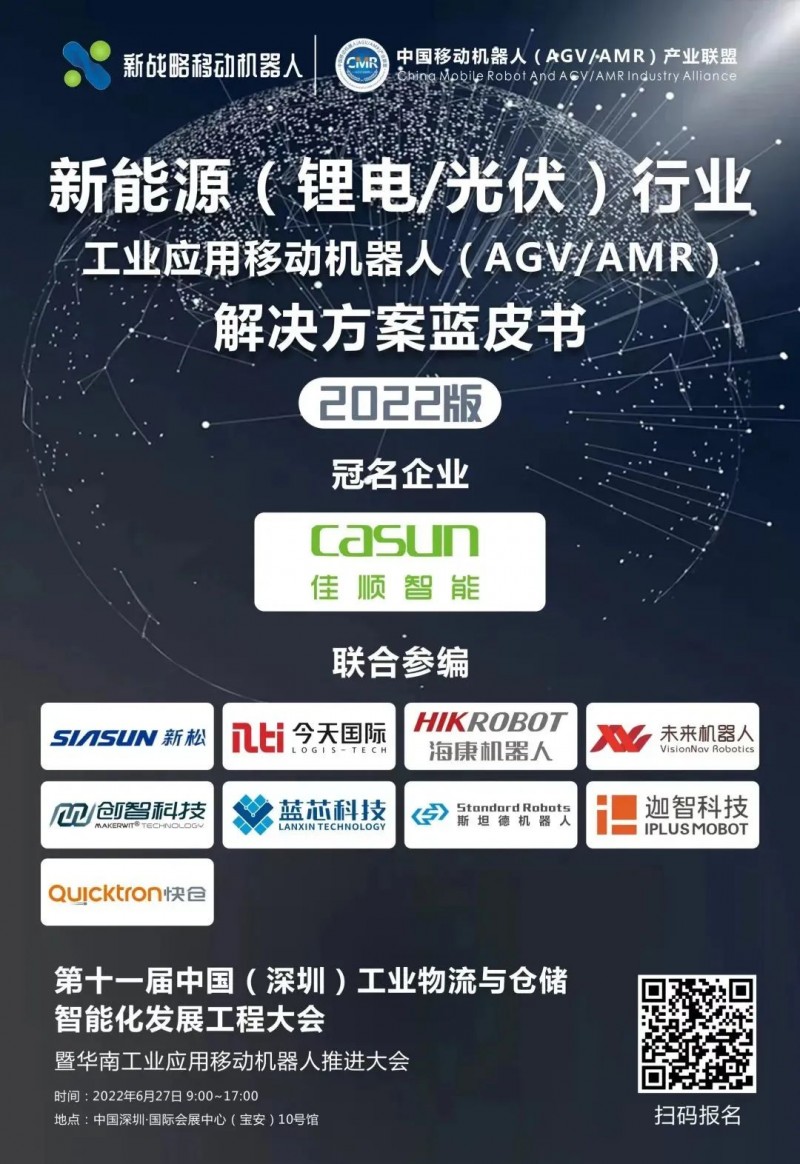 為了更好地解讀新能源行業移動機器人應用現狀及趨勢,6月27日,由中國移動機器人(AGV/AMR)產業聯盟、新戰略移動機器人產業研究所主編的《新能源行業用移動機器人(AGV/AMR)解決方案藍皮書(2022版)》將在“中國(深圳)工業物流與倉儲智能化發展工程大會暨華南工業應用移動機器人推進大會”上正式發布!