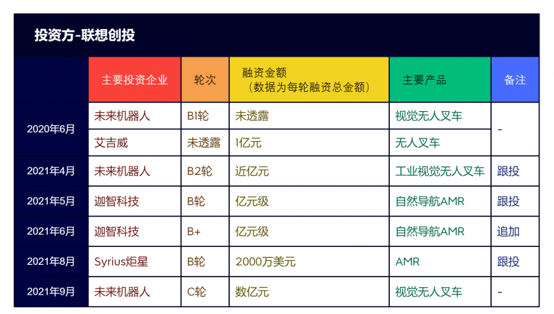 2020年至2021年,聯(lián)想創(chuàng)投在移動機器人行業(yè)參與了7起融資事件,被投企業(yè)包括未來機器人、艾吉威、迦智科技、Syrius炬星。
