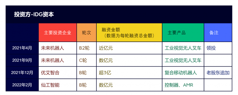 2021年4月至2022年2月期間,IDG資本在移動機器人領(lǐng)域投資了未來機器人、優(yōu)艾智合和仙工智能三家移動機器人企業(yè)。